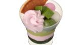 みるくゼリーといちごムースの上にピンク色の団子と苺クリーム大福を乗せ、猫の肉球をイメージした可愛らしい見た目のパフェです。