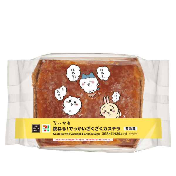 ちいかわたちが飛び跳ねていたザラメ付きカステラをイメージした商品。ザラメのざくざく食感としっとりとした生地のコントラストが楽しめます。