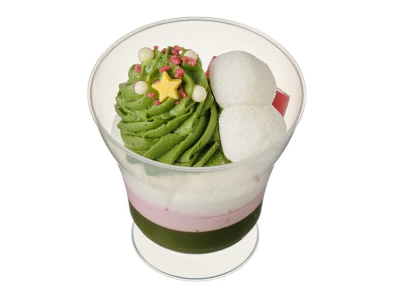 抹茶プリン,いちごムースとみるくムースの上にツリーをイメージした抹茶あんホイップ,雪だるまに見立てた団子,ギフトBOXをイメージしたいちご寒天をのせたパフェです。