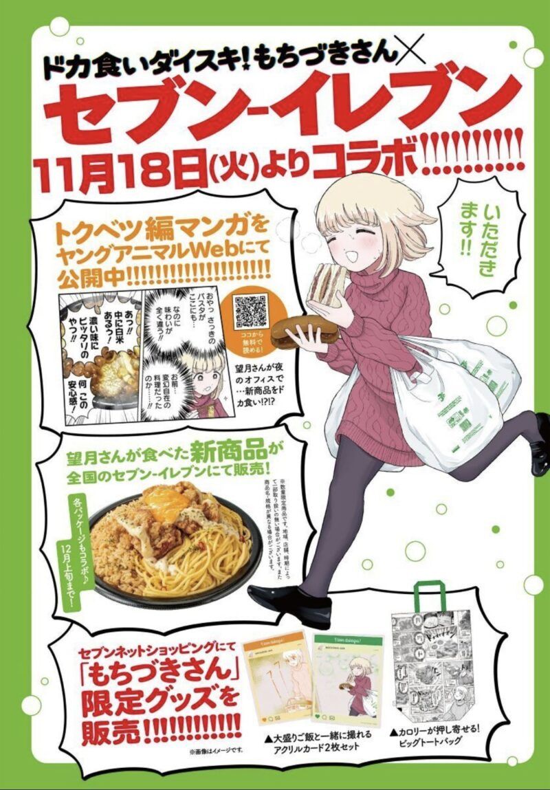 セブンイレブンでは『ドカ食いダイスキ!もちづきさん』とコラボしたキャンペーンを開催しています。