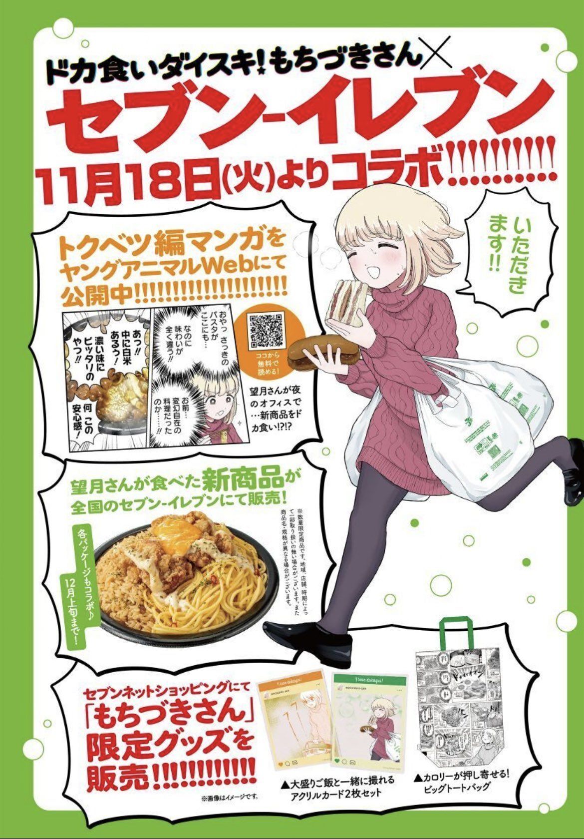 セブンイレブン『ドカ食いダイスキ!もちづきさん』コラボが2025年11月18日(火)より開催します!オリジナル商品が順次販売!