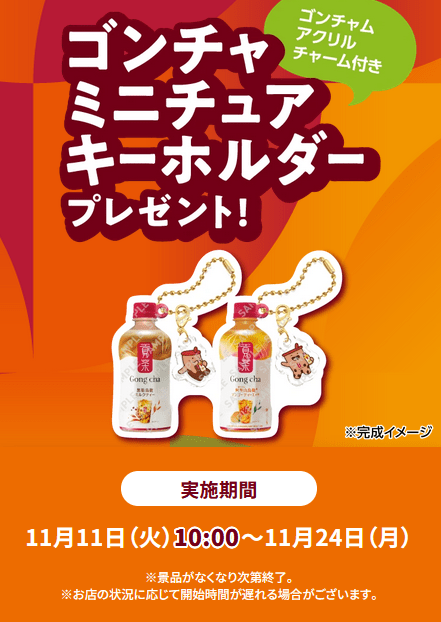 ゴンチャ(Gong cha)では、2025年11月11日(火)から、セブンイレブン限定の販売促進キャンペーンを開催します!対象商品を購入するとゴンチャミニチュアキーホルダー(ゴンチャムアクリルチャーム付き)のおまけが店頭でもらえます!