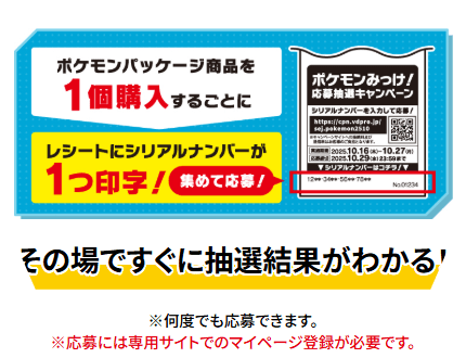 期間中、ポケモンオリジナルパッケージ商品を1個買うごとに、レシートにシリアルナンバー1つが印字。