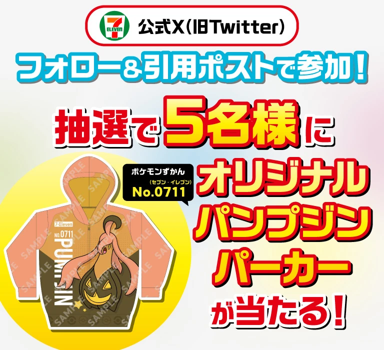 - セブンイレブン・ジャパン公式X(旧Twitter)フォロー&引用ポストで参加! 抽選で5名様に ポケモンずかん No.0711(セブン‐イレブン) オリジナル パンプジンパーカーが当たる!