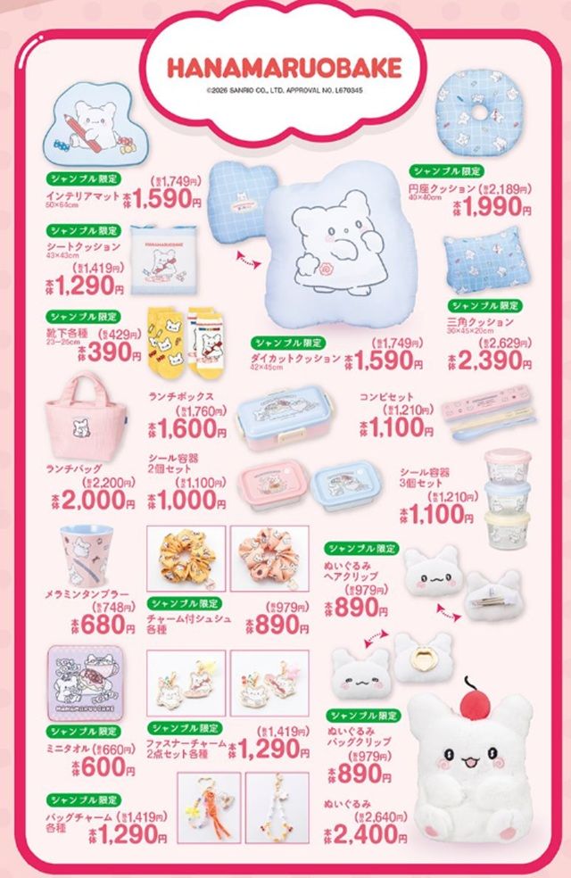 シャンブル『サンリオ』コラボを2026年4月11日(土)~販売します。はなまるおばけのクッション、チャーム、ランチグッズなどがラインナップ!