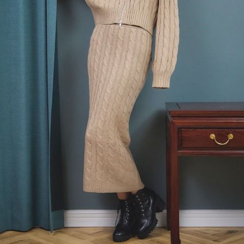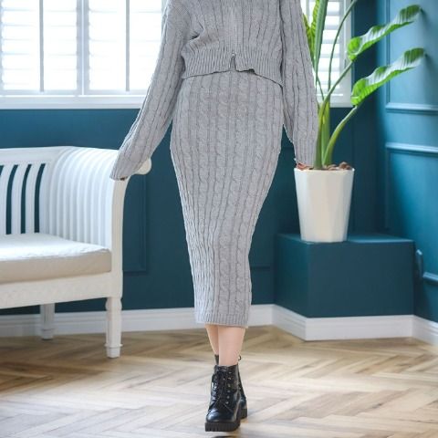 縦ラインを強調するケーブル編みで、すっきり細見えを叶えるナロースカート。