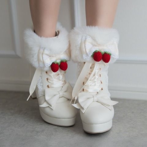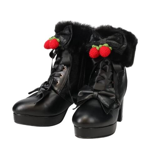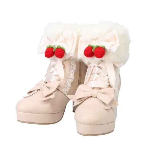 大きなリボンと繊細なレース、ふわふわのエコファーを組み合わせた、とびきりガーリーなデザインブーツです。フロントにはハンドメイド風のいちごモチーフがちょこんと付いて、他にはない可愛らしさを演出しています。