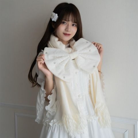 顔まわりをぱっと華やかにしてくれる、ビッグリボン付きのケープ。
