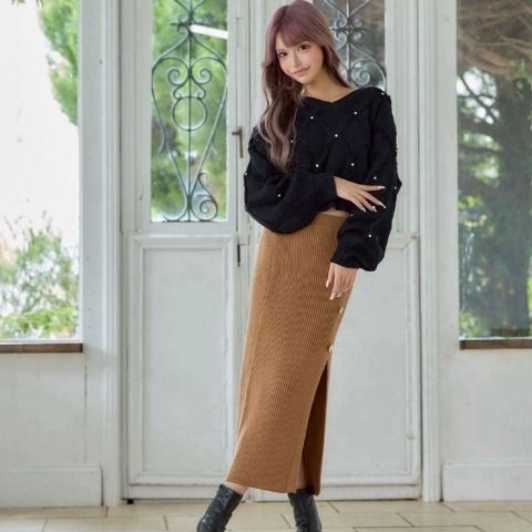 ウエスト付近でリブに切り替えてあり、ふんわりニットトップスとタイトスカートを合わせたようなシルエットがこれ一枚で完成します。