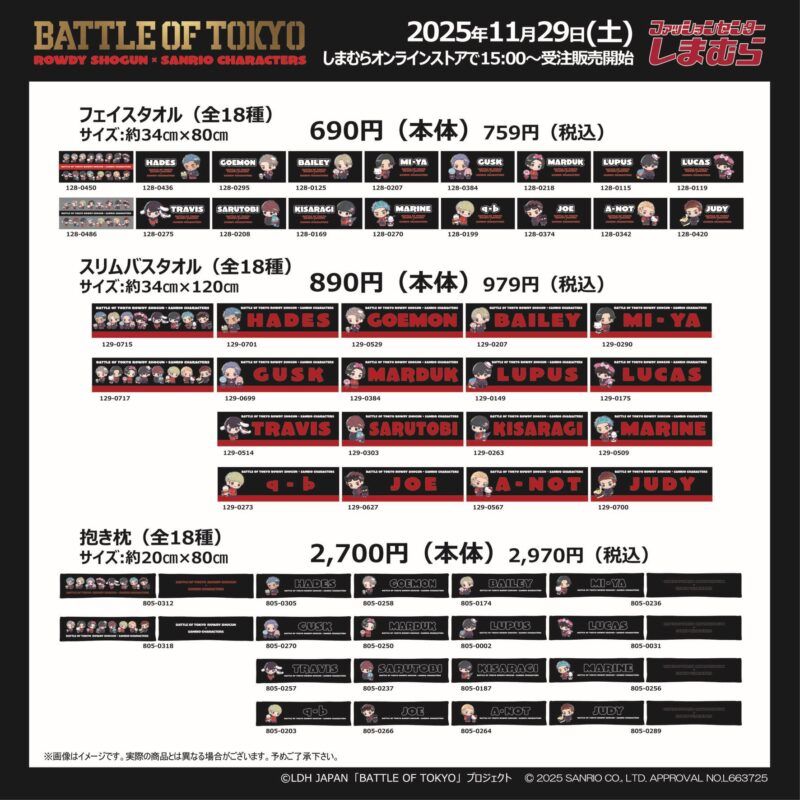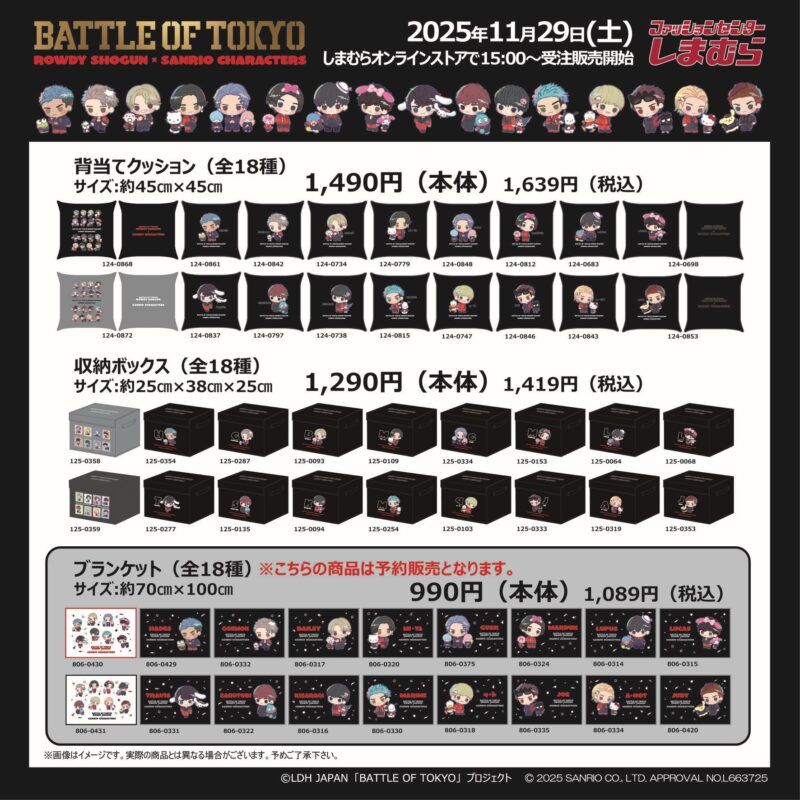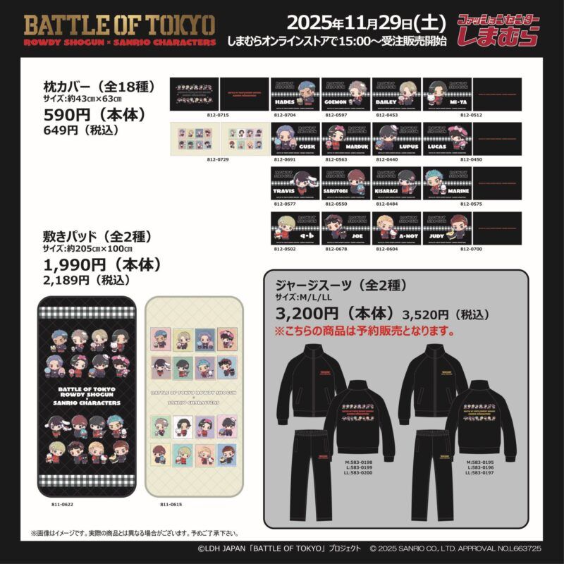 しまむら『サンリオ×BOT(BATTLE OF TOKYO ROWDY SHOGUN)』コラボを2025年12月29日(土)~販売します。ジャージ、バッグ、ポーチ、クッション、タオル、ブランケット、アクスタ、アクキーなどがラインナップ!