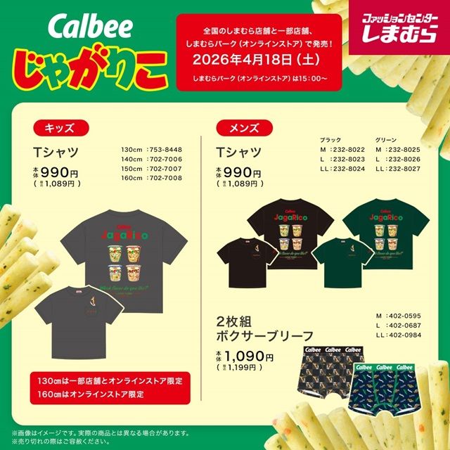 - しまむら『カルビー』コラボ!ポテトチップス、じゃがりこのTシャツ、ボクサーブリーフが2026年4月18日(土)より新発売!
