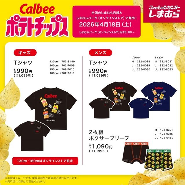 しまむら『カルビー』コラボを2026年4月18日(土)~販売します。ポテトチップス、じゃがりこのTシャツ、ボクサーブリーフがラインナップ!