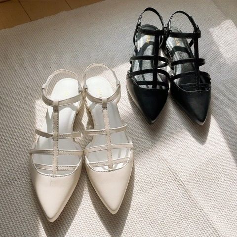 程よいポインテッドトゥとストラップデザインが新鮮な一足。