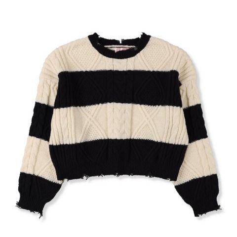 前身頃にはケーブル編みで表情豊かなボーダーニットになっています。