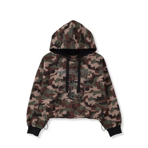 迷彩総柄のプルパーカーにキラキラのラインストーンのナンバリングロゴがかわいいプルパーカーです。裏起毛素材であたたかいです。