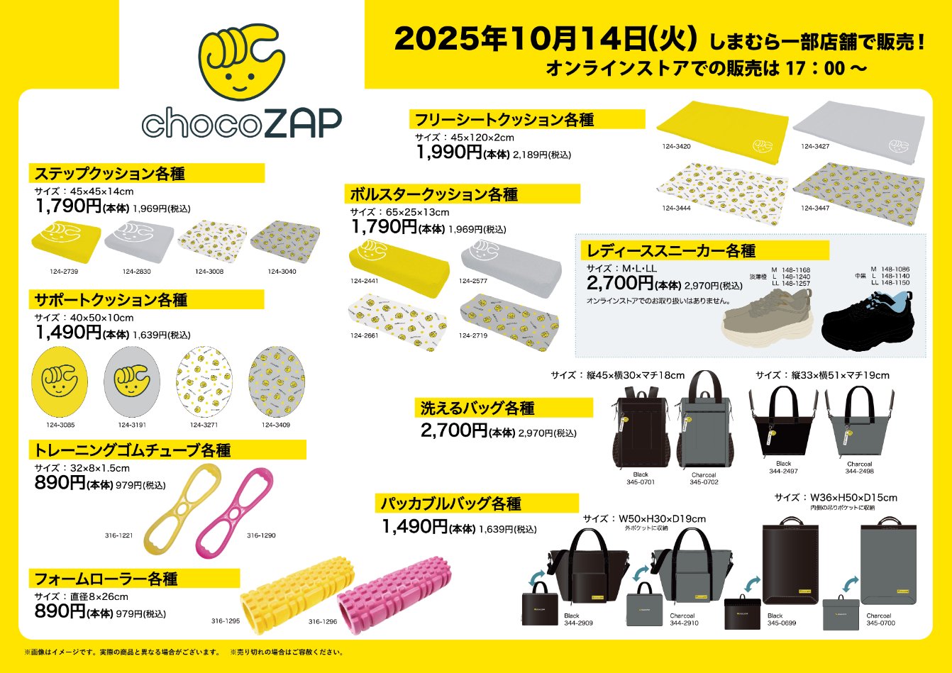 しまむら『chocoZAP (チョコザップ)』コラボを2025年10月14日(火)~販売します。バッグ、クッション、スニーカー、宅トレにも便利なグッズがラインナップ!