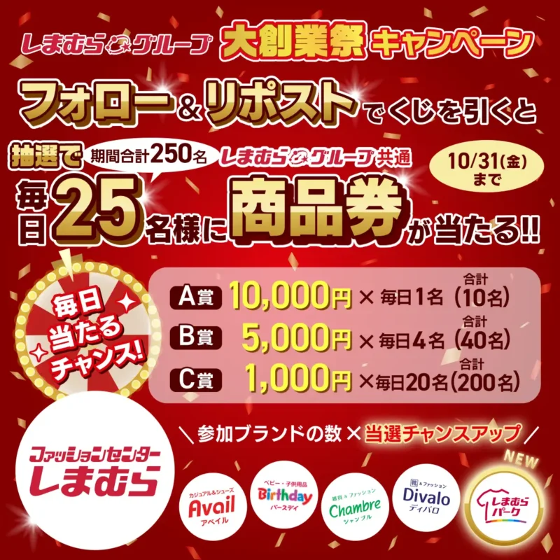 しまむらグループ大創業祭と、しまむらパーク(オンラインストア)OPENを記念し、しまむら・アベイル・バースデイ・シャンブル・ディバロ・しまむらパークの6つのX公式アカウントにてキャンペーンを実施します。