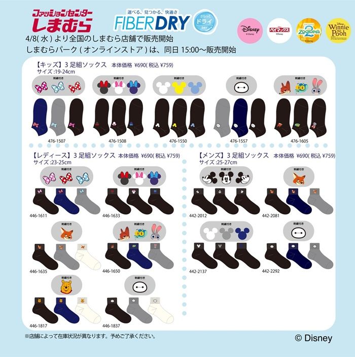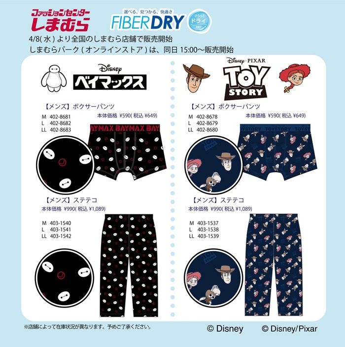 4/8(水)全国のしまむら店舗と、しまむらオンラインストアにて「FIBER DRY」と「Disney」「Disney・PIXAR」のコラボアイテムが登場!