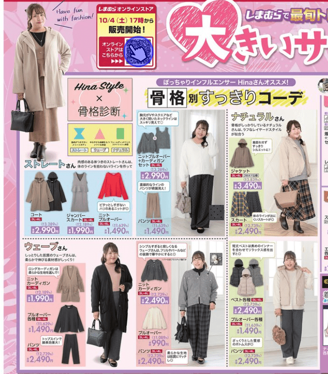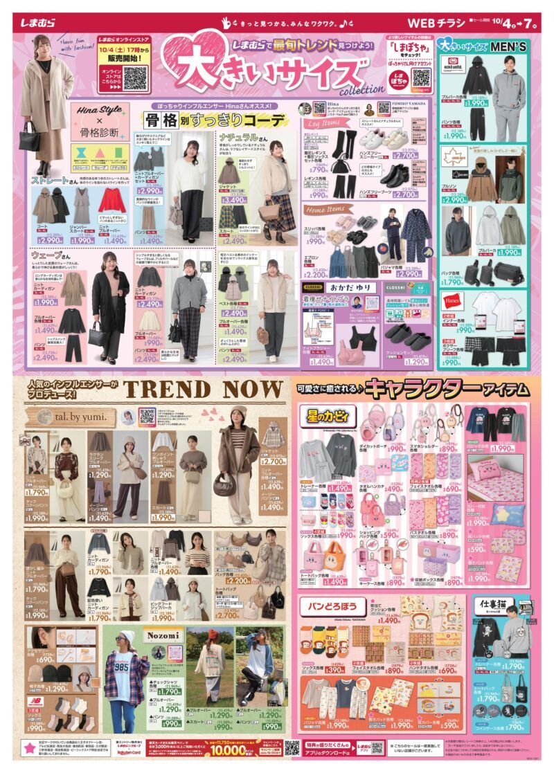 しまむらチラシ速報2025年10月4日~Hina、おかだゆり、LOGOSなど秋冬の大きいサイズ特集!星のカービィ、パンどろぼう、仕事猫のコラボ!tal. by yumi.淡色カジュアル、Nozomiも新発売!