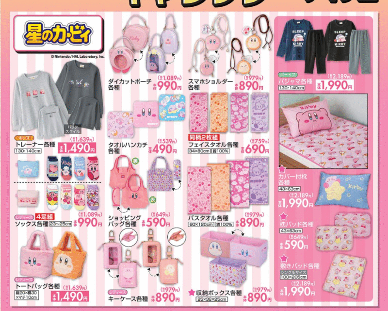 『星のカービィ』コラボのトレーナー、パジャマの秋冬アパレル、ぬいぐるみポーチ、ファーバッグ、エコバッグ、ハンカチ、タオル、ソックスなどの雑貨が新発売!