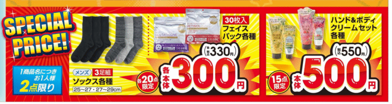 ソックスやコスメなどが、広告の品で目玉商品として展開です!