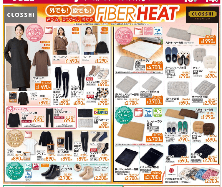 しまむらのPB(プライベートブランド)CLOSSHIから、ファイバーヒートの冬アイテムが販売します。インナー、アパレル、ルームウェア、ブーツ、インテリアアイテムも販売します。