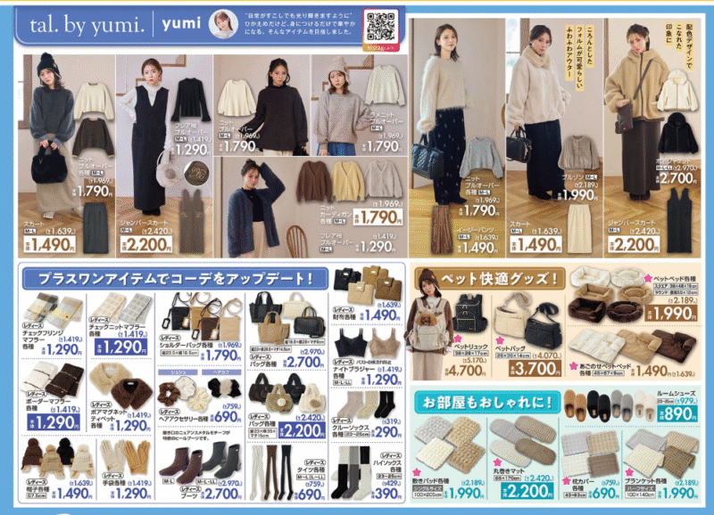 しまむら『tal.by yumi.(ゆみ)』コラボ!アパレル、バッグ、財布、ベルト、ブーツ、帽子、手袋、マフラー、アクセサリー、ルームウェア、レギンス、インナー、ペットグッズなど冬アイテム