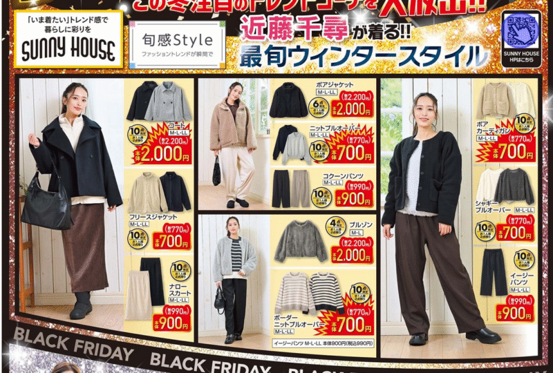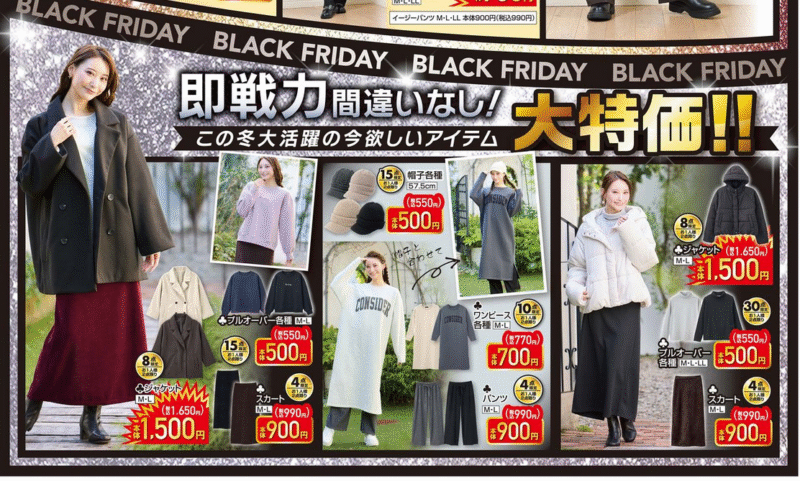 ジャケット、にっよ、スカート、パンツもブラックフライデーのセールでお買い得です。