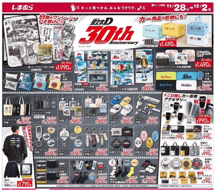 しまむら『頭文字D』コラボ!トレーナーなど冬のアパレル、ソックス、トートバッグ、カー用品、チャームのグッズ、タオル、ブランケット、収納ボックスなどが2025/11/28より新発売!