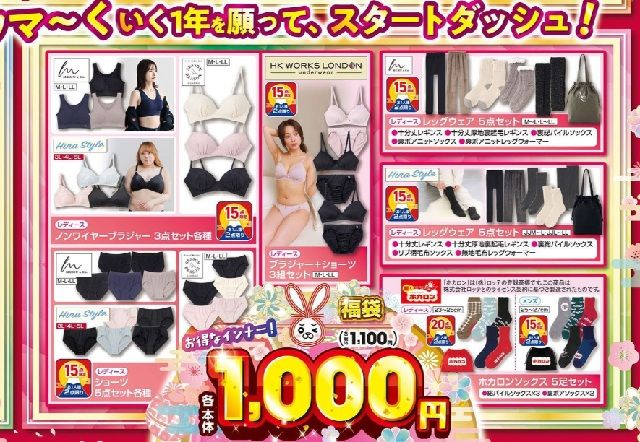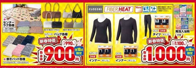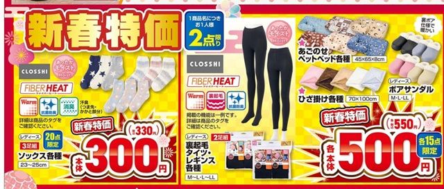 300円ソックス、500円の裏起毛タイツ・レギンス、900円のバッグ、1000円んおファイバーヒートインナーなど、実用的なグッズも多くオススメです!