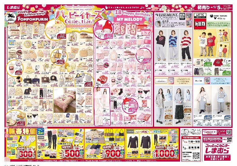 しまむらチラシ速報 2026年1月1日の初売り~福袋が店頭販売!ポムポムプリン、マイメロディのサンリオ大型コラボ、トミカ×LITTC×ディズニーの春コーデも!