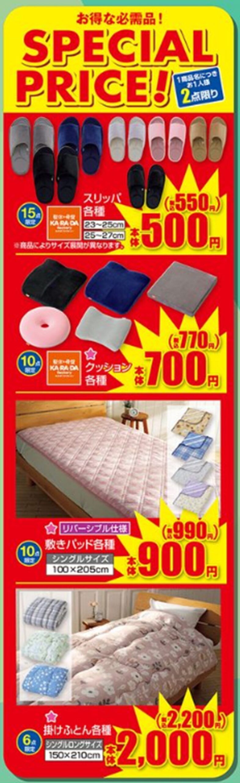 布団、クッション、スリッパなど、冬の生活を快適にしてくれるアイテムもお買い得価格で展開します!