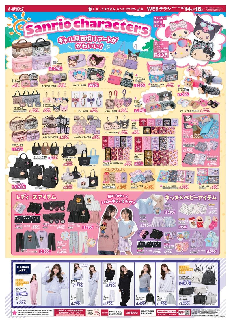 しまむらチラシ速報 2026年2月14日~ギャルっぽサンリオの大型コラボが新発売!Reebok(リーボック)のアパレル、バッグなども!