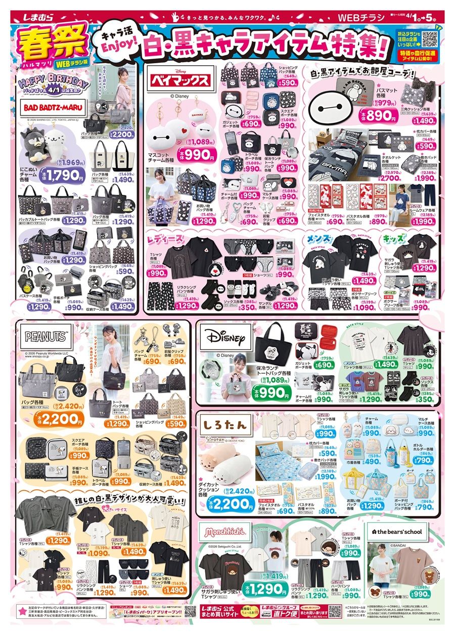 しまむらチラシ速報 2026年4月1日~春祭で日替わりセール、血行促進ウェアが新発売!白・黒キャラアイテム特集は、バッドばつ丸、スヌーピー、しろたん、ベイマックス、ミッキーなどのコラボも!