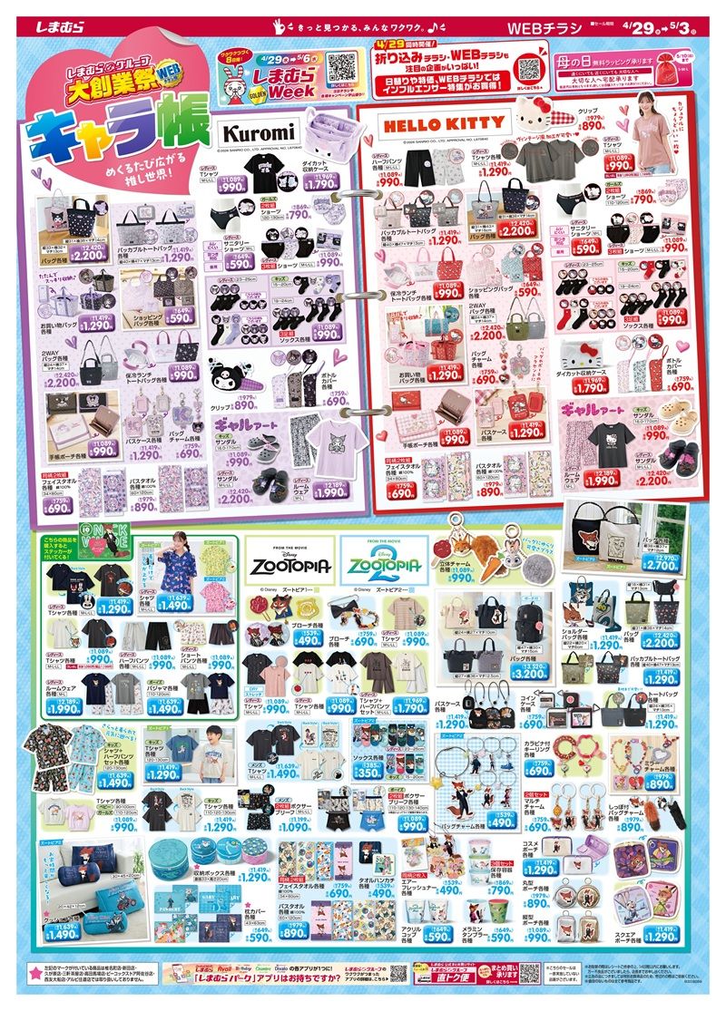 しまむらチラシ速報 2026年4月29日~大創業祭第2弾!GWセールで日替わり商品やハッピーバッグも!ズートピア、クロミ、キティのキャラクターコラボも充実!