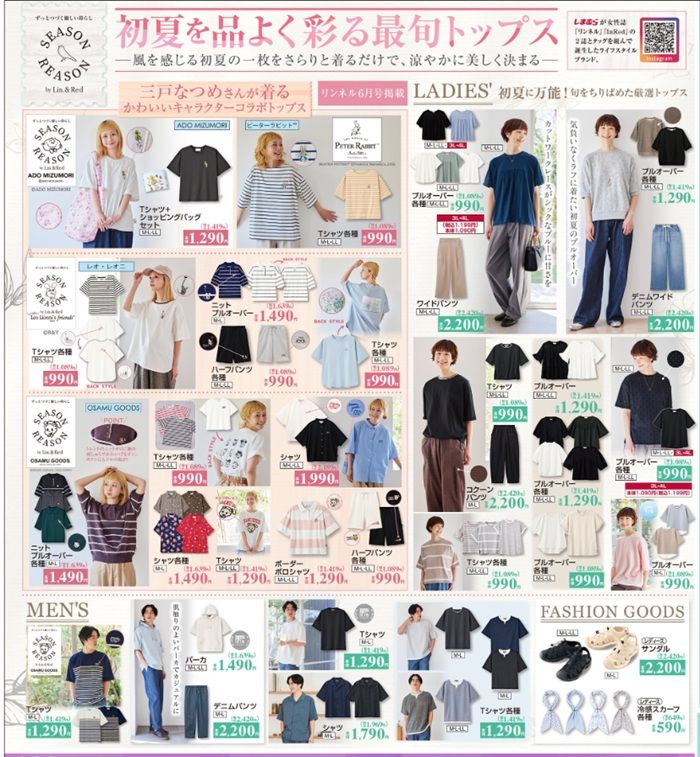 しまむらオリジナルブランド「SEASON REASON by Lin.&Red(シーズンリーズン バイ リンアンドレッド)」の豪華コラボレーションでは、タレントの三戸なつめさんが人気キャラクターとのコラボアイテムを着こなします。そのほか、これからの季節にぴったりの人気インフルエンサーコラボアイテムも注目です!