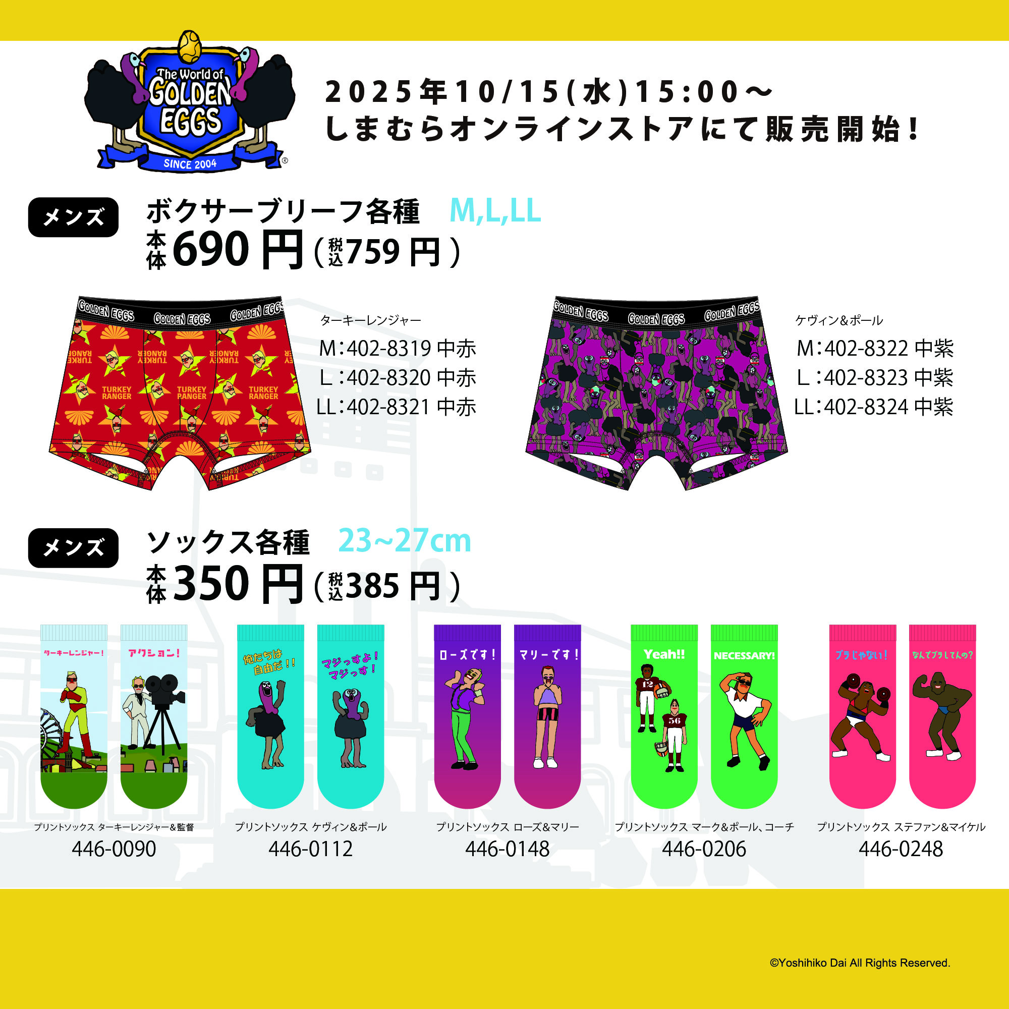 しまむら『ゴールデンエッグス』コラボを2025年10月4日(土)~販売します。ボクサーブリーフ、ソックスがラインナップ!