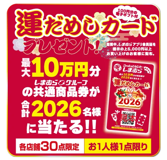 1/ 1(木・祝)より、店舗で税込5,000円以上お買い上げのうえ、しまむらアプリ会員証をご提示いただいたお客様に、運だめしカードを1枚プレゼント。抽選で最大10万円分のしまむらグループ共通商品券が合計2,026名様に当たります。なくなり次第終了となります。