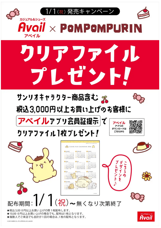 1/ 1(木・祝)より、店舗でサンリオ商品を含む税込3,000円以上お買い上げのうえ、アベイルアプリ会員証をご提示いただいたお客様に、カレンダークリアファイルを1枚プレゼント。なくなり次第終了となります。