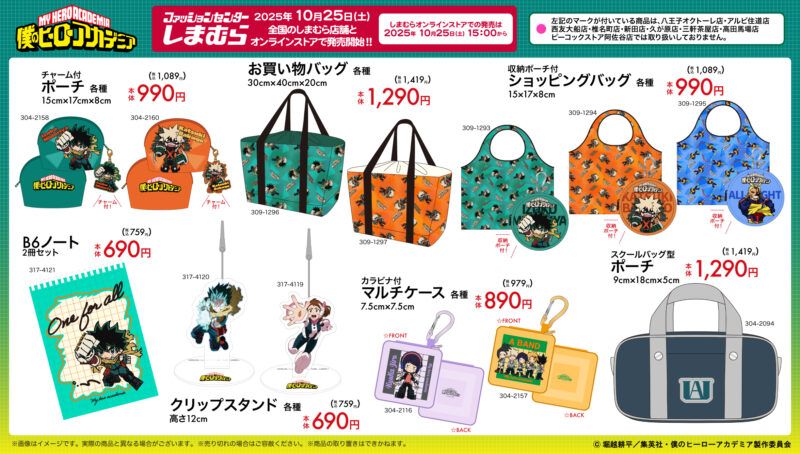 しまむら『ヒロアカ(僕のヒーローアカデミア)』コラボの新作を、2025年10月25日(土)~販売します。ポーチ、エコバッグ、ぬいぐるみチャーム、コインケース、タオル、寝具、収納ボックス、腹巻き、使い捨てカイロの冬グッズなどがラインナップ!