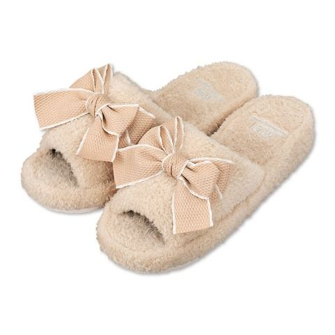 もこもこ生地が気持ち良い、大きな配色リボンが特徴的なゆったりサイズのスリッパです。