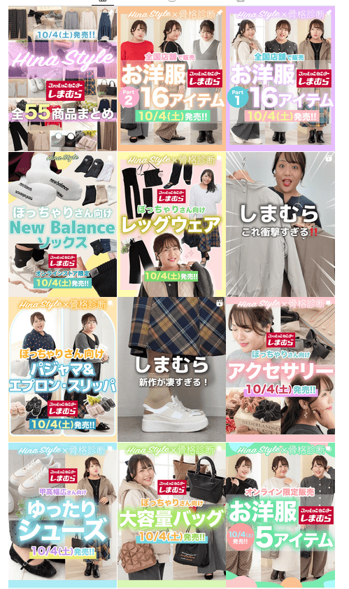しまむら『HINA』コラボを2025年10月4日(土)~販売します。骨格診断の秋コーデ、バッグ、シーズ、レッグウェア、アクセサリーなどがラインナップ!全55アイテムの大型企画になります。