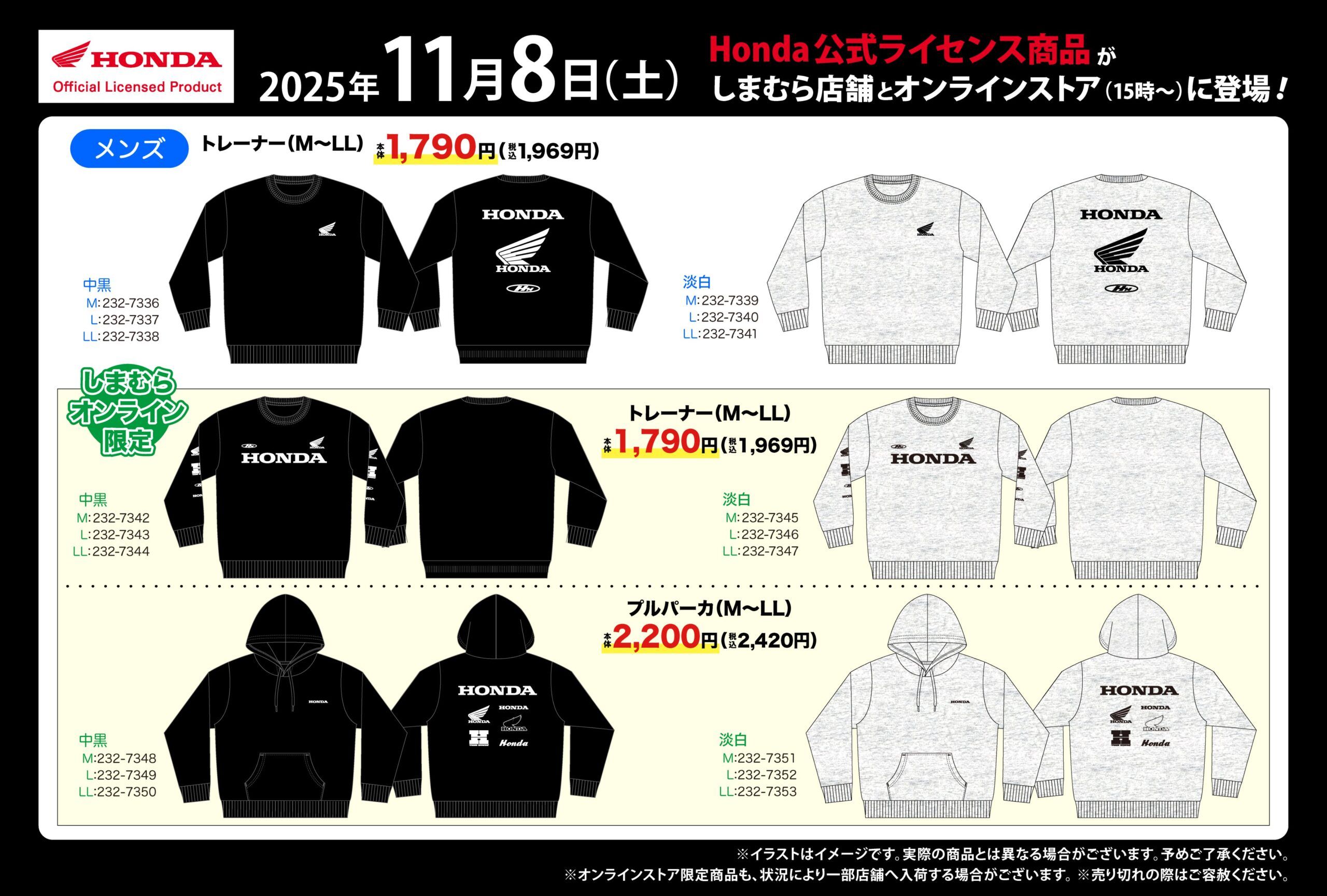 しまむら『ホンダ(HONDA)』コラボを2025年11月8日(土)~販売します。トレーナー、パーカの冬コーデがラインナップ!