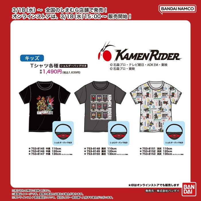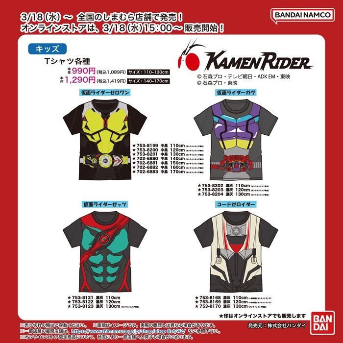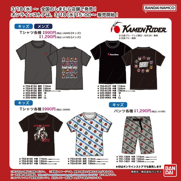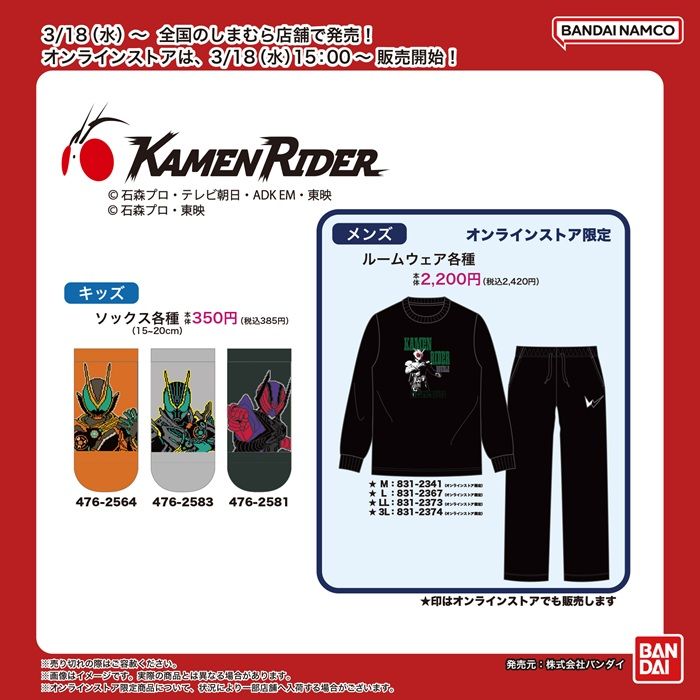 全国もしまむら店舗としまむらパーク(オンラインストア)にて3/18(水)より『仮面ライダーシリーズ』の商品が発売! オンラインストアは3/18(水)15:00~ しまむらパーク(オンラインストア)にて販売開始!