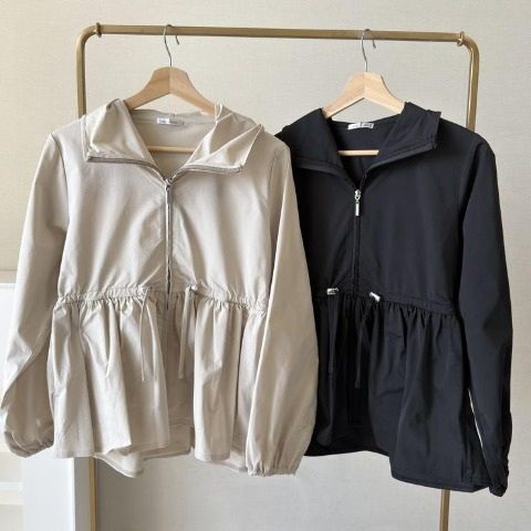 ウエストにドロストがつデいたペプラムシルエットのジップパーカーです。