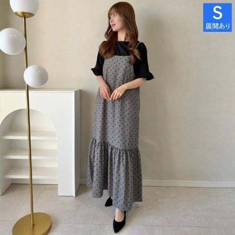 ビスチェの肩リボンのディティールとインナーブラウスのシアー素材のドット柄で、ガーリー感のあるアンサンブルに仕上げました。