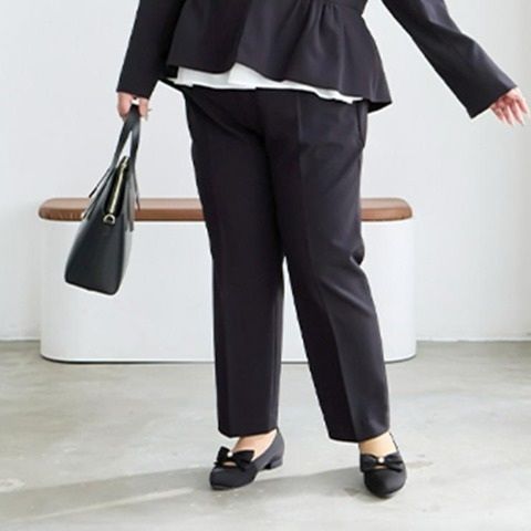 身体のラインを拾いにくい点も嬉しいポイント。きちんと見えするデザインでありながら後ろウエストがゴム仕様で楽なはき心地です。