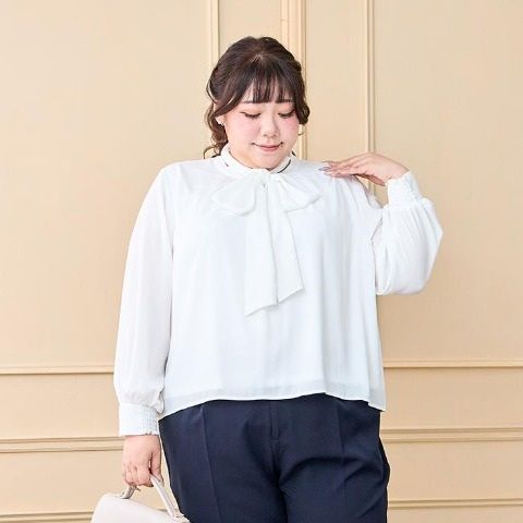 トレンドのボウタイは取り外し可能、シンプルなギャザーブラウスと2通り楽しめます。
