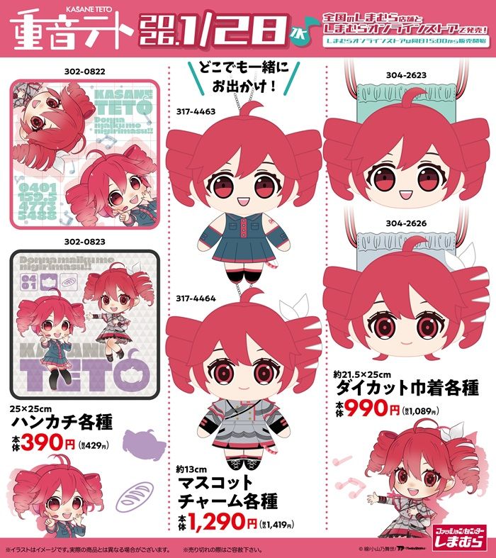 しまむら『重音テト』コラボを2026年1月28日(水)~販売します。マスコットチャーム、フェイス巾着、ハンカチがラインナップ!春のファッショングッズフェア第2弾の目玉商品です!