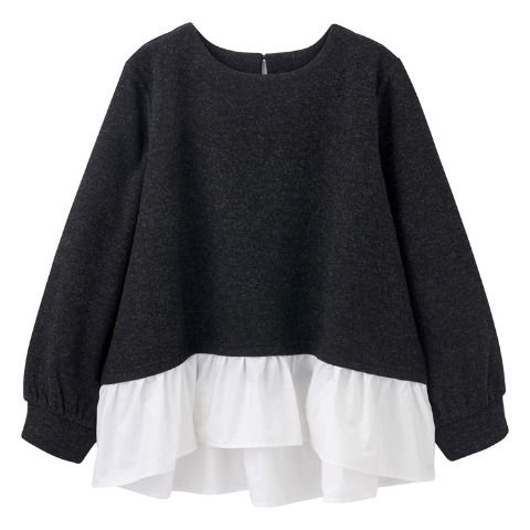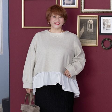 柔らかな起毛ポンチ素材と、布帛素材をドッキングさせたレヤード風トップスです。ゆとりのあるサイズ感で裾のペプラムフリルが自然に体型カバーしてくれます。1枚でサマになるデザインなので、シンプルなボトムともコーディネートしやすいです。